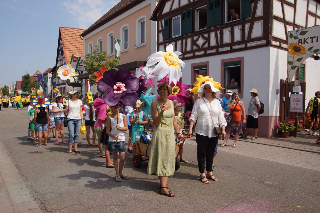 Trotz der hohen Temperaturen ließen es sich viele Gruppen nicht nehmen, immer wieder Tanz- und Schaueinlagen aufzuführen und ernteten dafür verdienten Applaus von den Zuschauern. Auch die Tradition kam mit einem alten Pferdewagen und einer Gruppe aus Birkweiler mit alten Kinderwagen, der älteste davon aus dem Jahr 1860, nicht zu kurz. Das Motto des Festes zeigten die Motivwagen der Ortsgemeinde mit einer Malerpalette und der Kulturgemeinde mit einem bunten Reiter, dem Festlogo. Von den knapp siebzig gemeldeten Zugnummern hatten lediglich eine Gruppe und drei Musikkapellen wegen der zu großen Hitze abgesagt. Kommentiert wurde der Festumzug von der 2. Vorsitzenden der Kulturgemeinde Rülzheim, Ursula Hitschler.