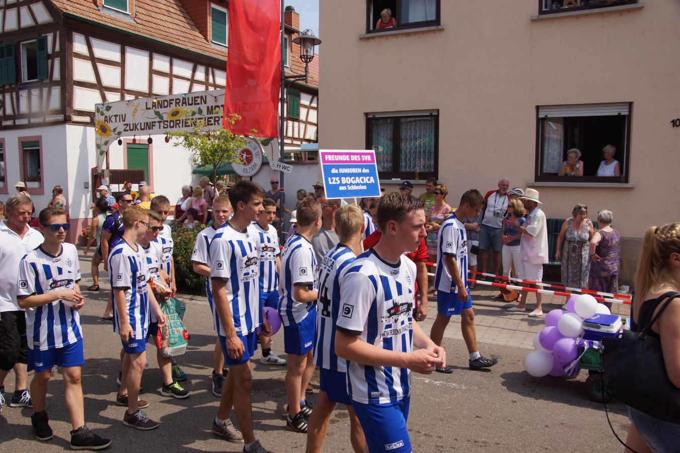 36 Fußgruppen, zwanzig Motivwagen und acht Musikkapellen, angeführt wie immer vom Musikzug „Rote Husaren“ der Freiwilligen Feuerwehr, die allerdings wegen der Hitze auf die Mitnahme ihres dreistöckigen Schellenbaums verzichtet hatten, nahmen die Kindergärten, Schulen und Vereine Bezug auf das bunte, vielfältige Leben in Rülzheim, bezogen sich aber auch auf aktuelle Ereignisse wie beispielsweise den im vergangenen Jahr im Rülzheimer Wald gefundenen Schatz, sogar der Speyerer, der den Schatz illegal ausgegraben hatte, war unter den Festzugsteilnehmern des Angelsportvereins, oder auf die auf dem Festwiesengelände im Bau befindliche Alla-Hopp-Anlage oder das untergegangene Moby Dick.
